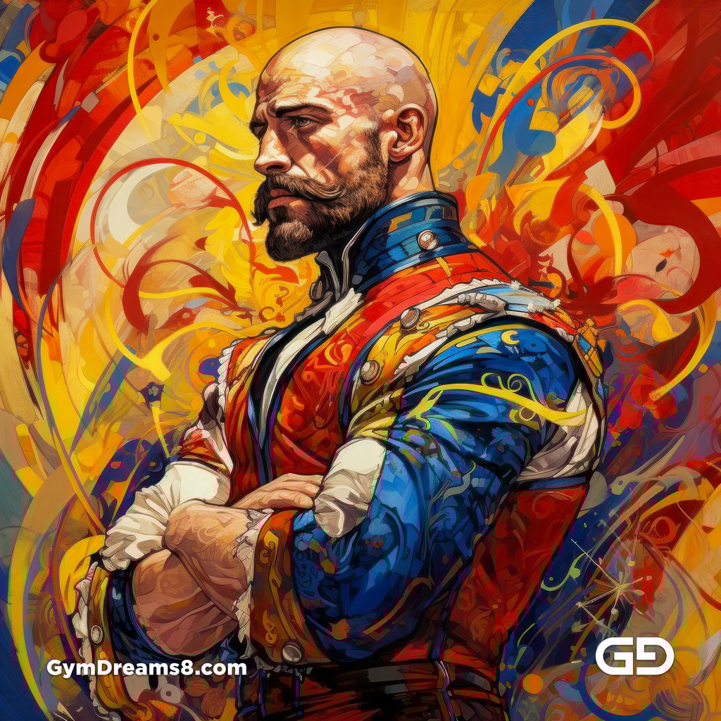 handsome french muscular man, trimmed beard, bald, bodybuilder, in the style of picasso, primary colors, red, blue, yellow, black, white, vibrant colors :: j. c. leyendecker::0.2