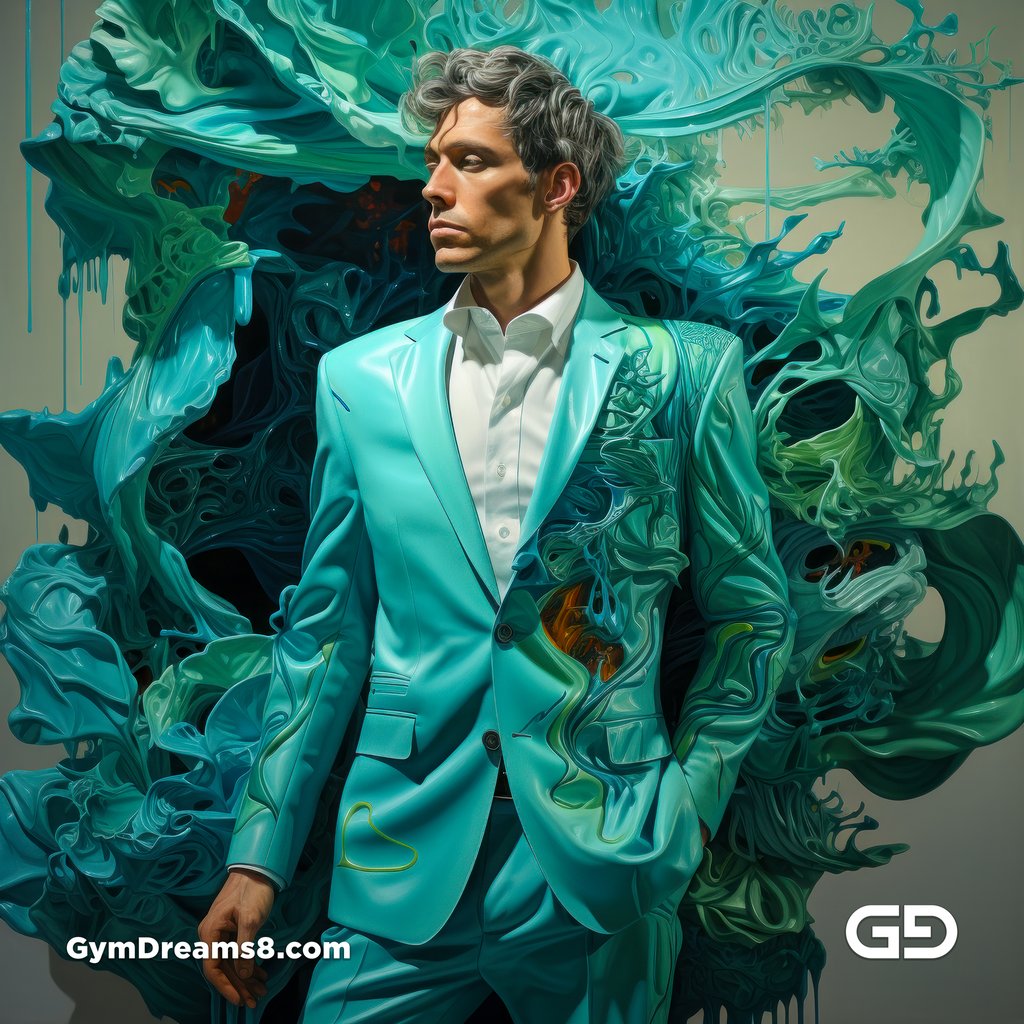 /imagine a man wearing a sylvan green jack, decorated in 3d, in the style of otherworldly paintings, multilayered surfaces, white and cyan, precise, detailed architecture paintings, melting, high detailed, vibrant colors