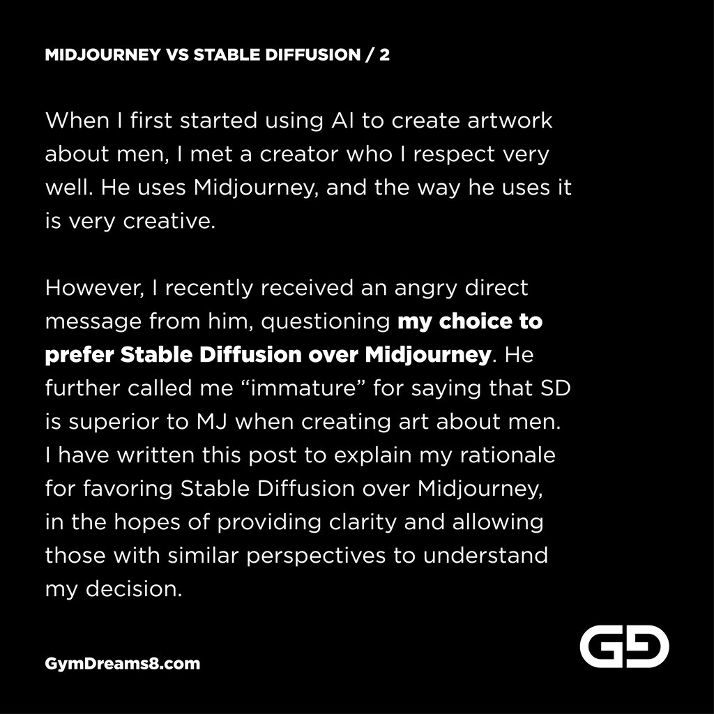However, I recently received an angry direct message from him, questioning my choice to prefer Stable Diffusion over Midjourney. He further called me “immature” for saying that SD is superior to MJ when creating art about men. I have written this post to explain my rationale for favoring Stable Diffusion over Midjourney, in the hopes of providing clarity and allowing those with similar perspectives to understand my decision.