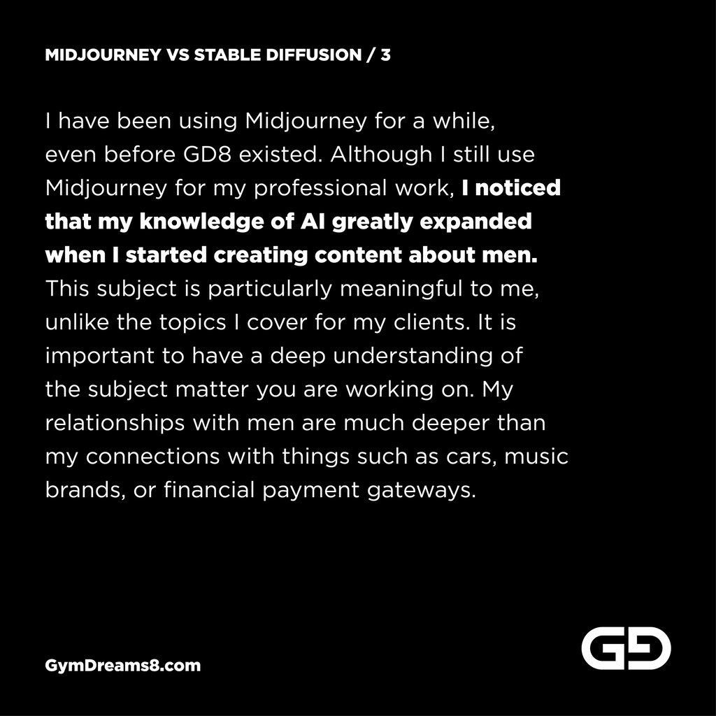 I have been using Midjourney for a while, even before GD8 existed. Although I still use Midjourney for my professional work, I noticed that my knowledge of AI greatly expanded when I started creating content about men. This subject is particularly meaningful to me, unlike the topics I cover for my clients. It is important to have a deep understanding of the subject matter you are working on. My relationships with men are much deeper than my connections with things such as cars, music brands, or financial payment gateways.